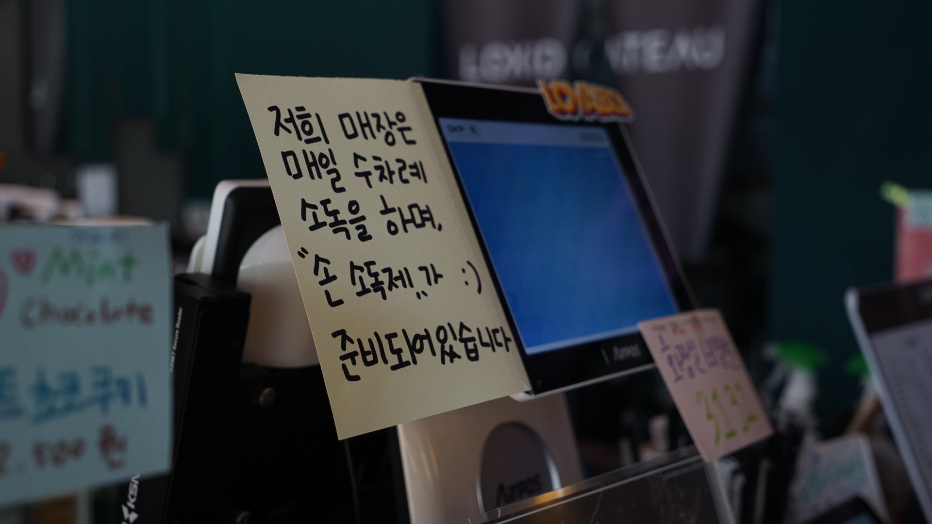 요즘 코로나 때문에 민감한지라 카운터에는 매장을 매일 소독하며 손소독제가 준비되어있다는 문구가 적혀져 있네요