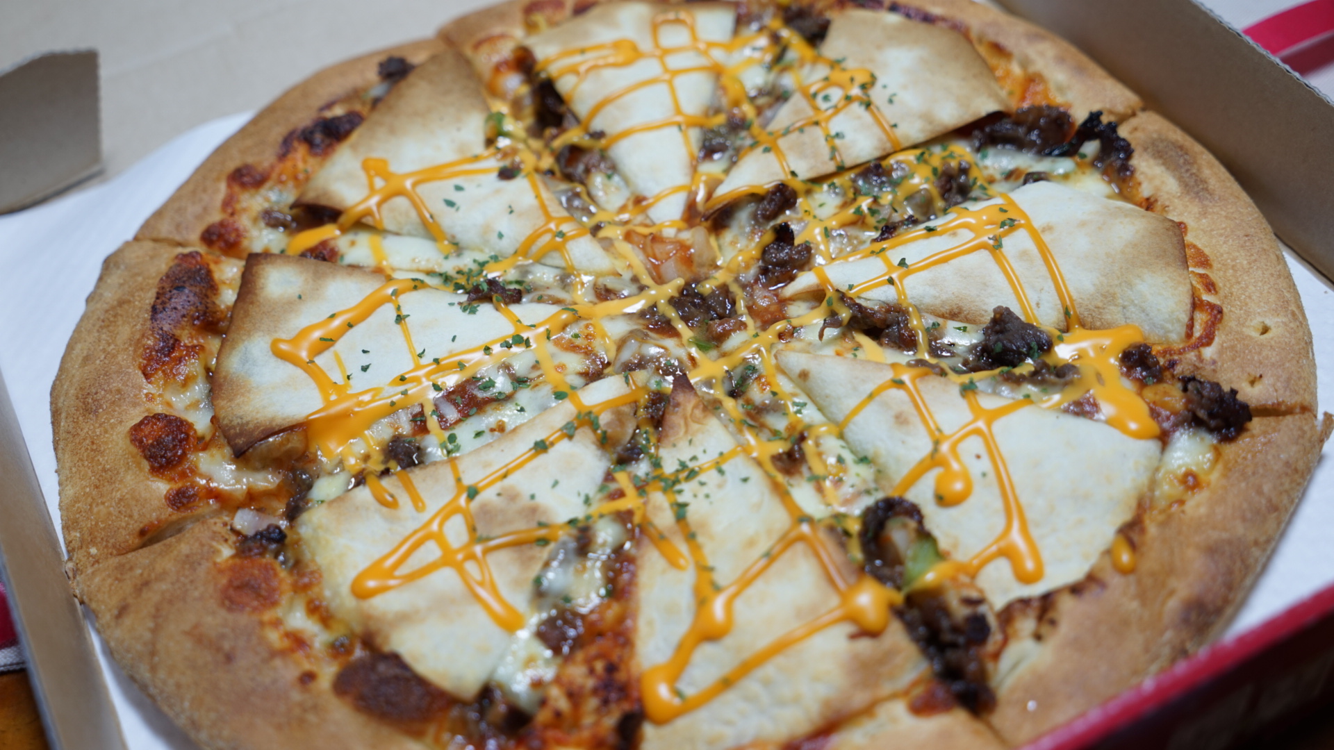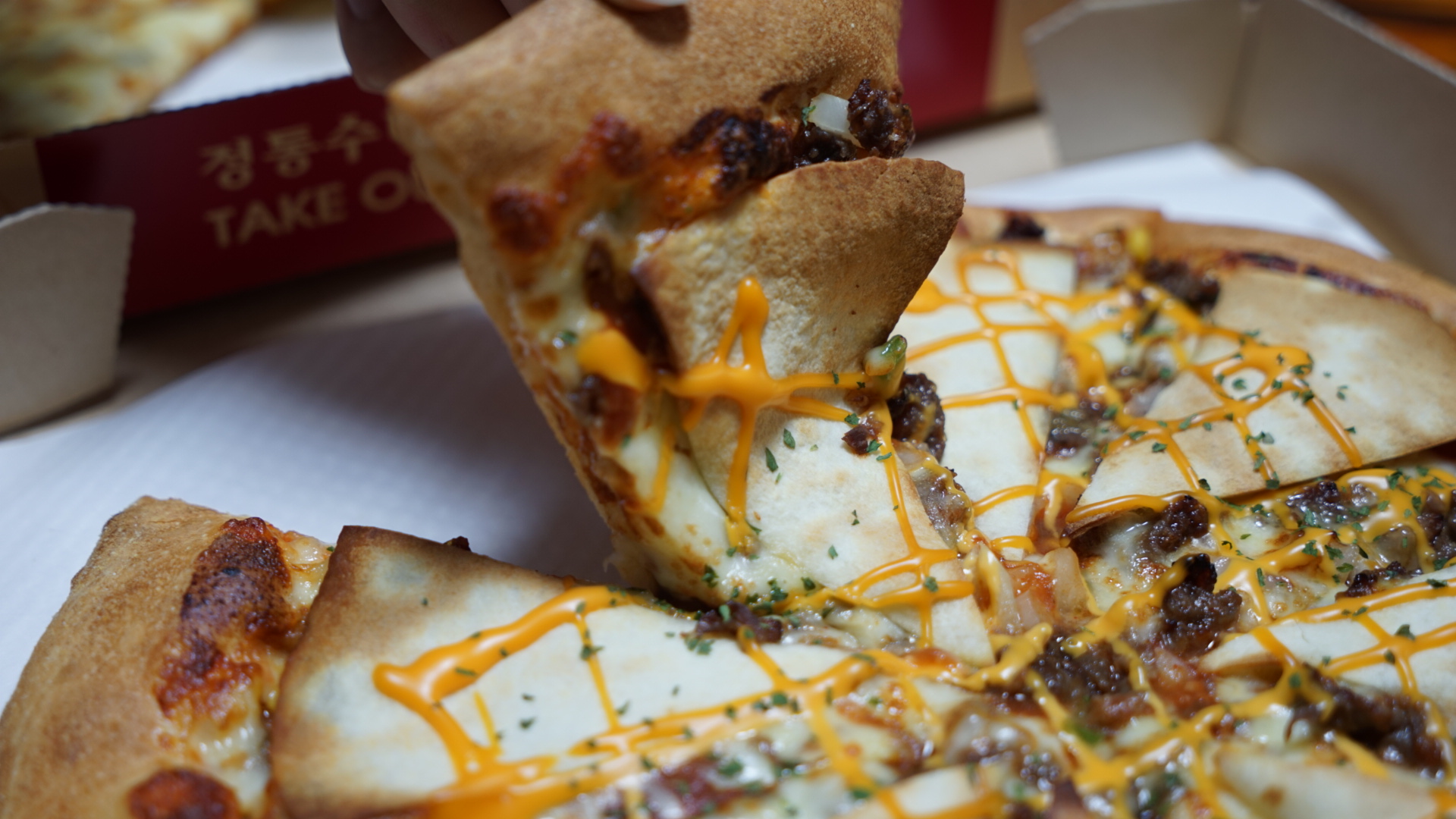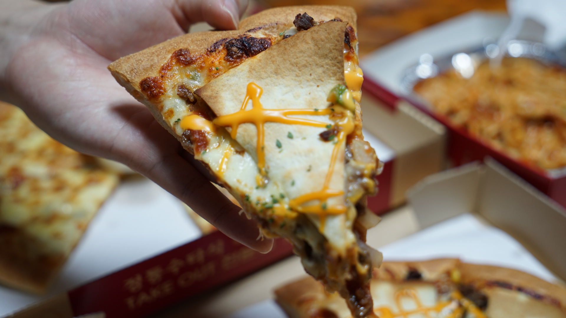 원래는 치킨 퀘사디아를 주문하려했는데 동생이 저번에 주문해서 먹었을 때 치킨 퀘사디아는 매웠다고 하더라구요 저희집은 전반적으로 매운 것을 잘 못먹어서 바로 고추 모양이 없는 비프퀘사디아로 주문 했습니다 비프 퀘사디아는 다른 피자와는 다르게 위에 바삭한 또띠아가 올려져 있습니다 불고기와 또띠아가 함께 피자로 만나니 멕시칸 음식 같은 느낌도 나더라구요 살짝 아쉬운 점은 저희가 핫소스를 따로 구매하는 것을 깜박했는데 핫소스까지 뿌려먹었으면 더 맛있게 먹을 수 있을 것 같습니다 없어도 담백하게 잘 먹었지만요 특히 불고기의 육즙이 입안 가득 해서 기분이 더 좋았던 것 같습니다