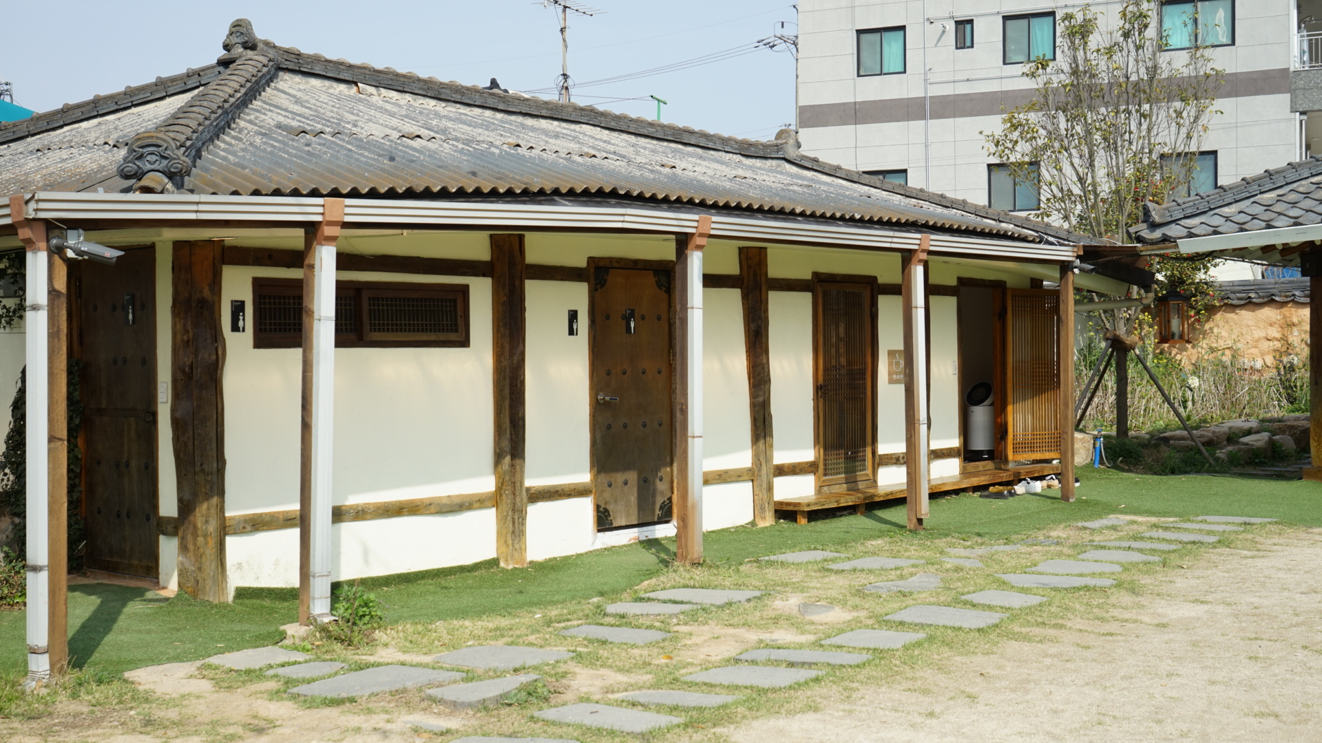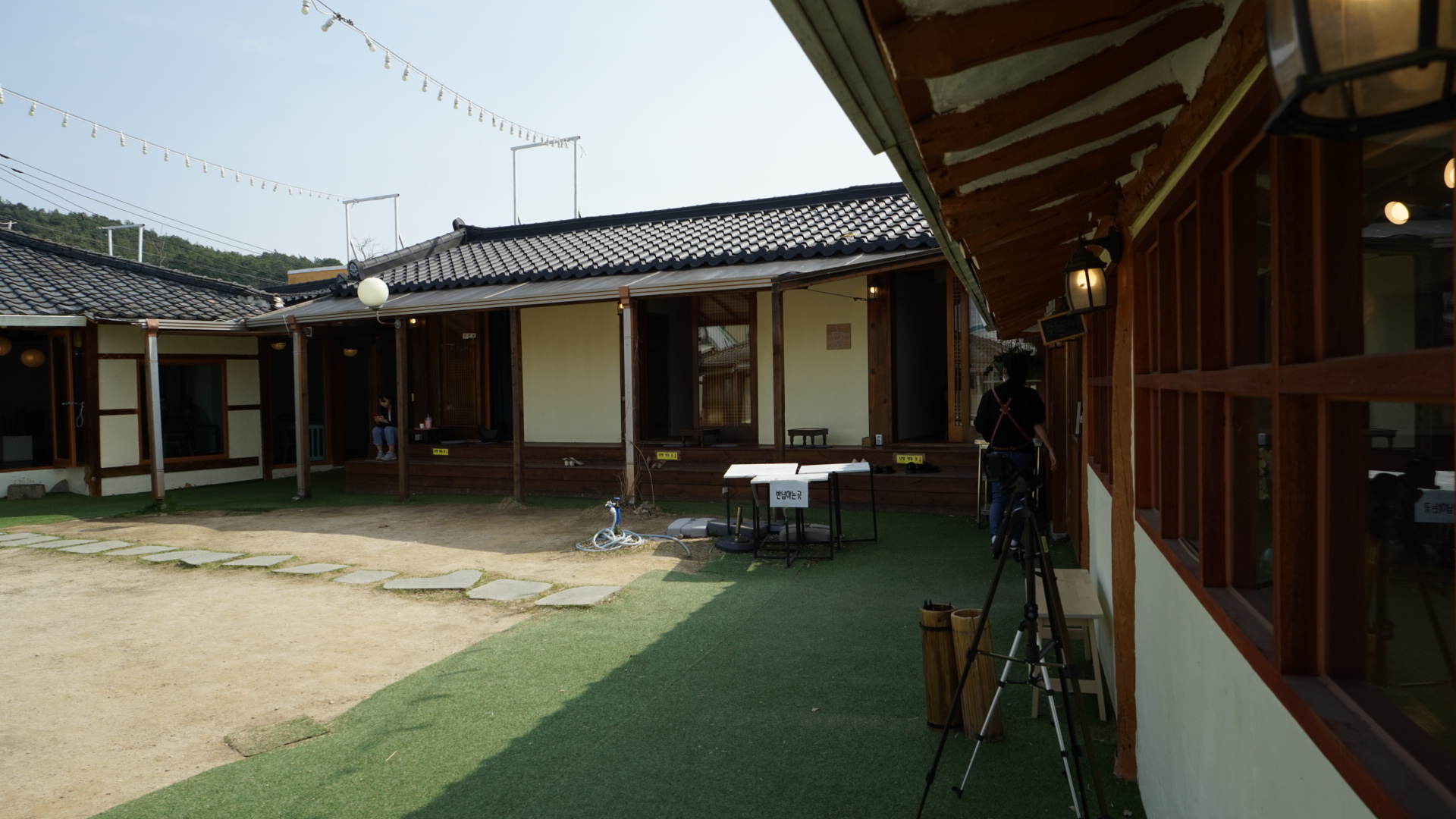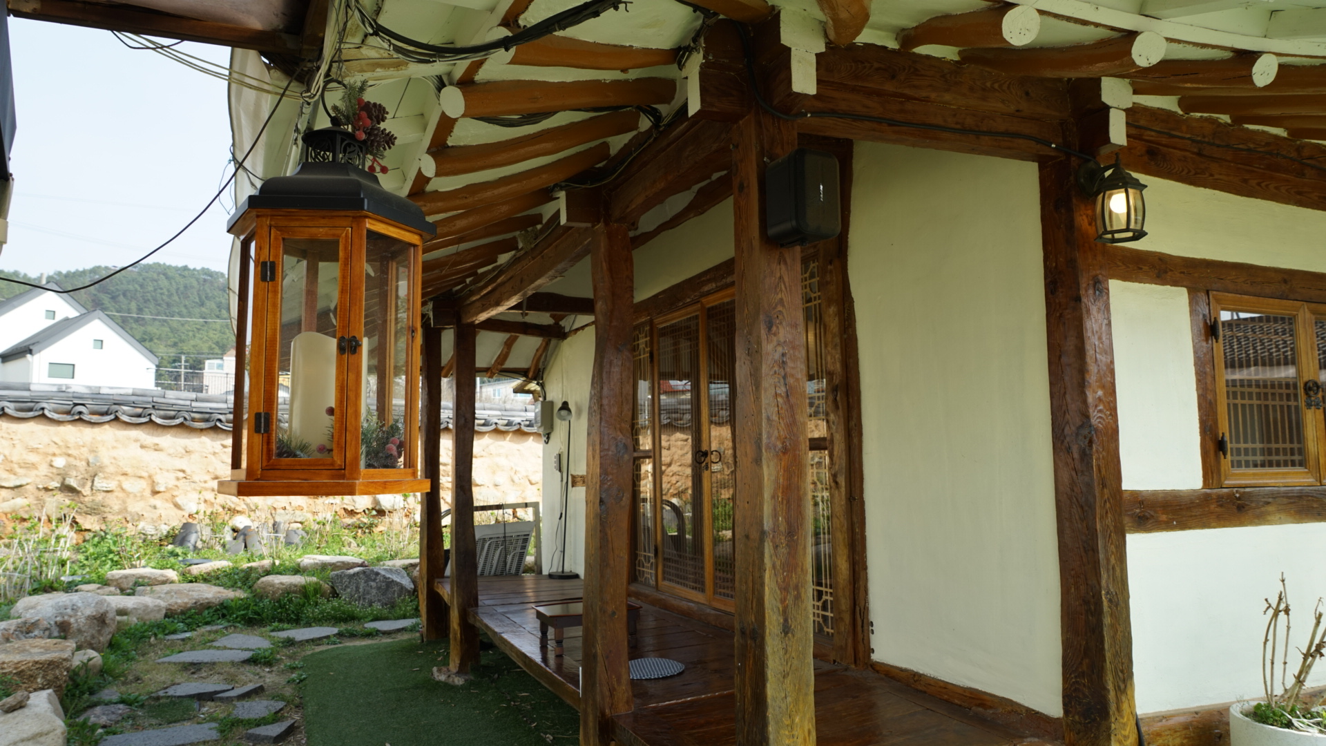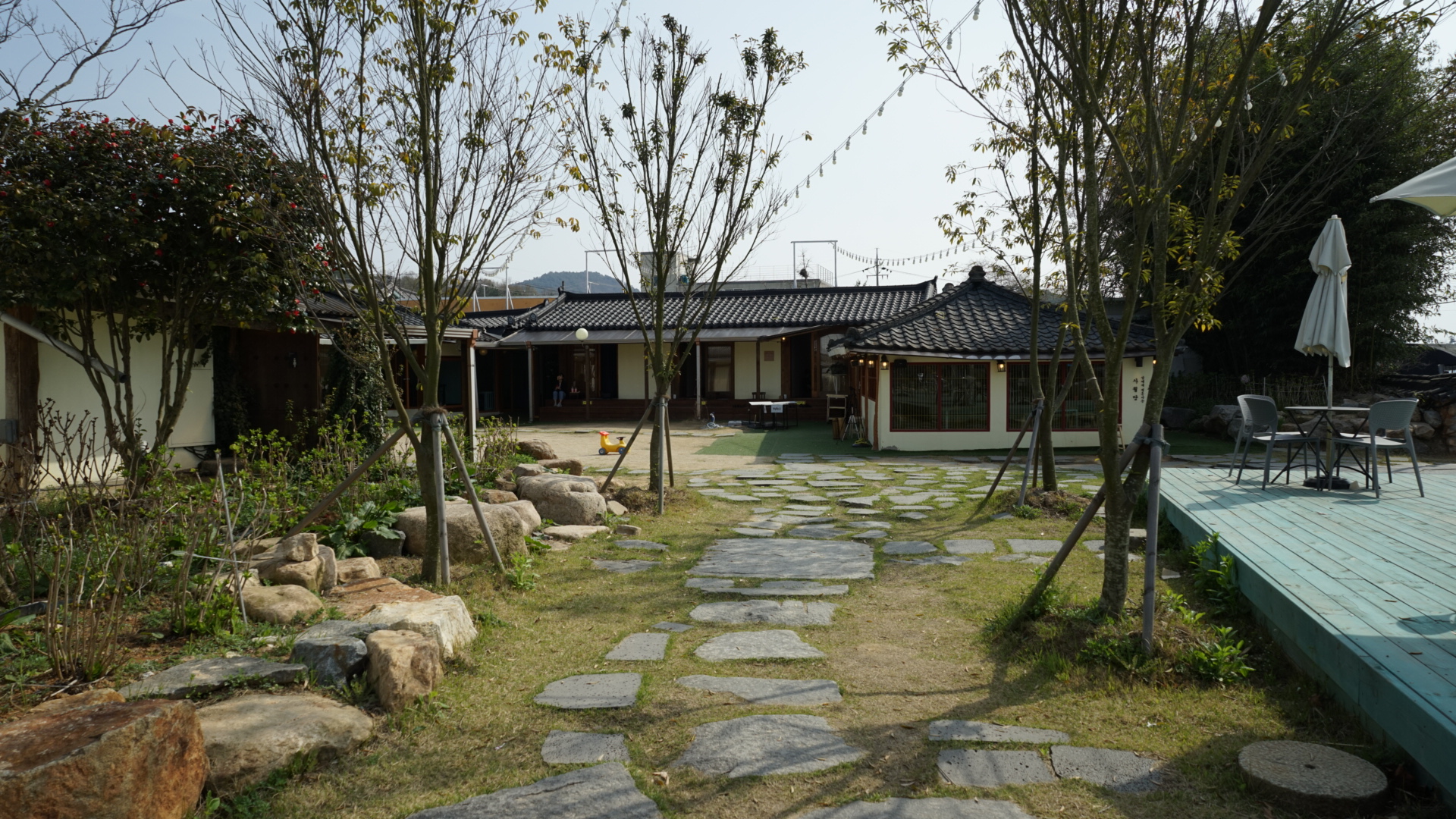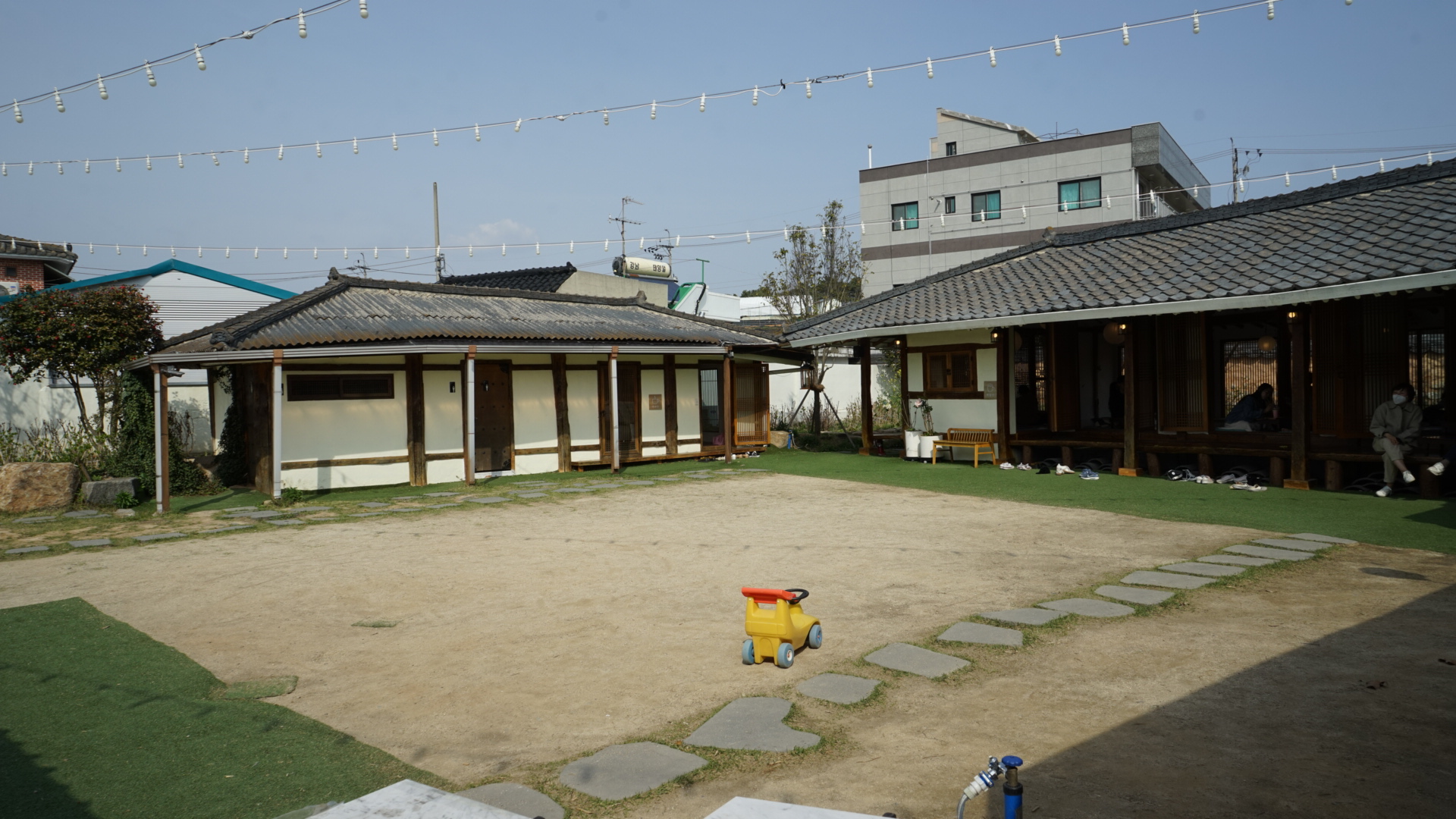 크고 높은 대문을 지나오면 야외 테라스와 한옥 3채가 저희를 기다리고 있습니다 가운데에는 넓은 마당도 있어서 날씨 좋은 날 아이들이 뛰어 놀기에도 참 좋더라구요
