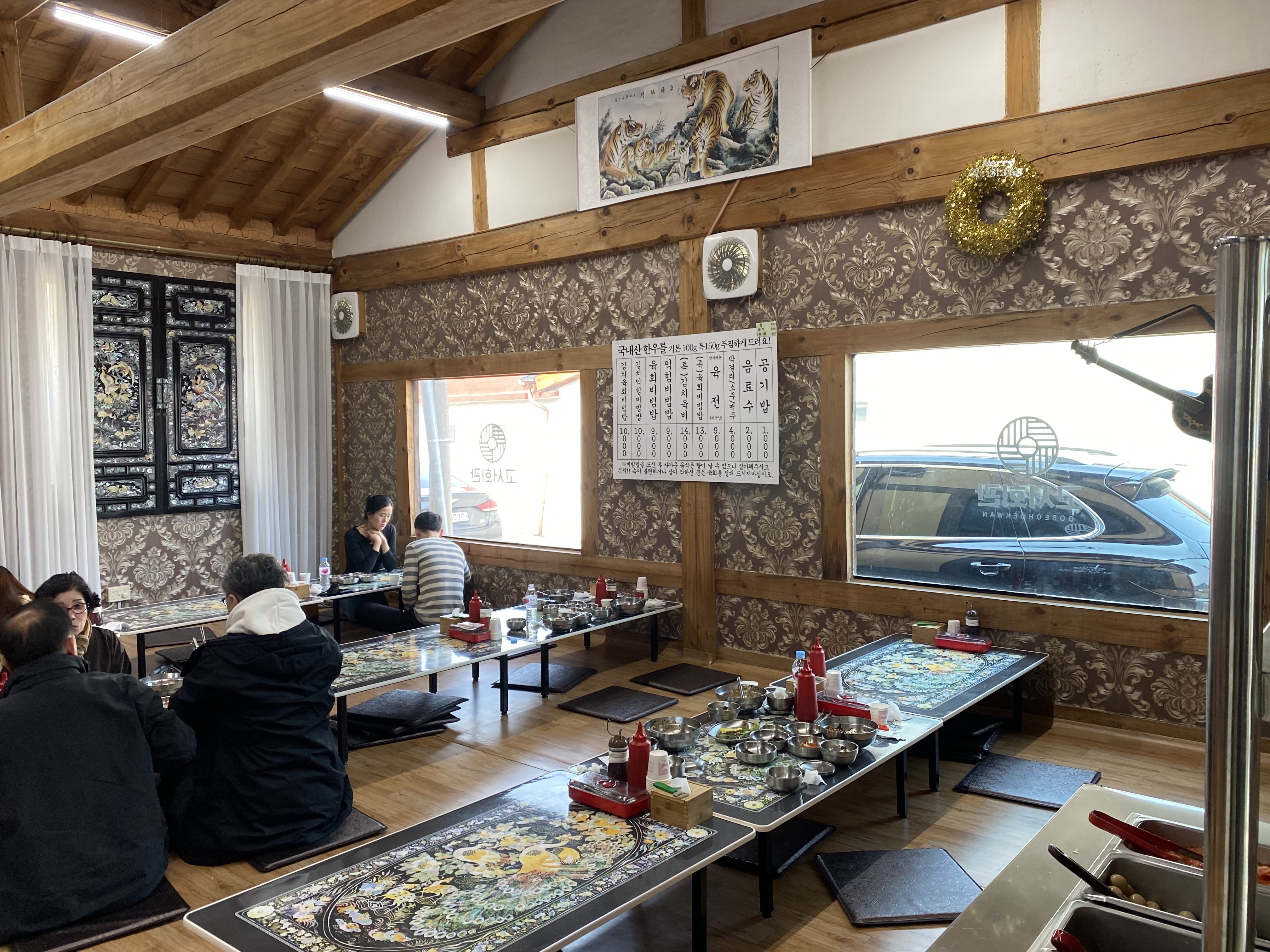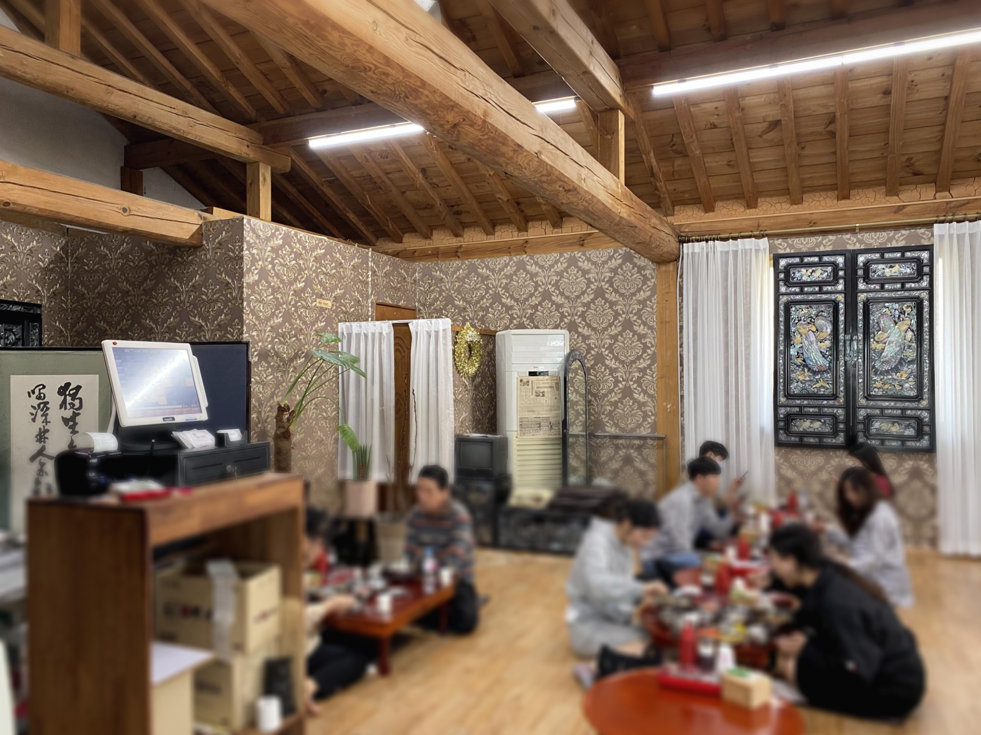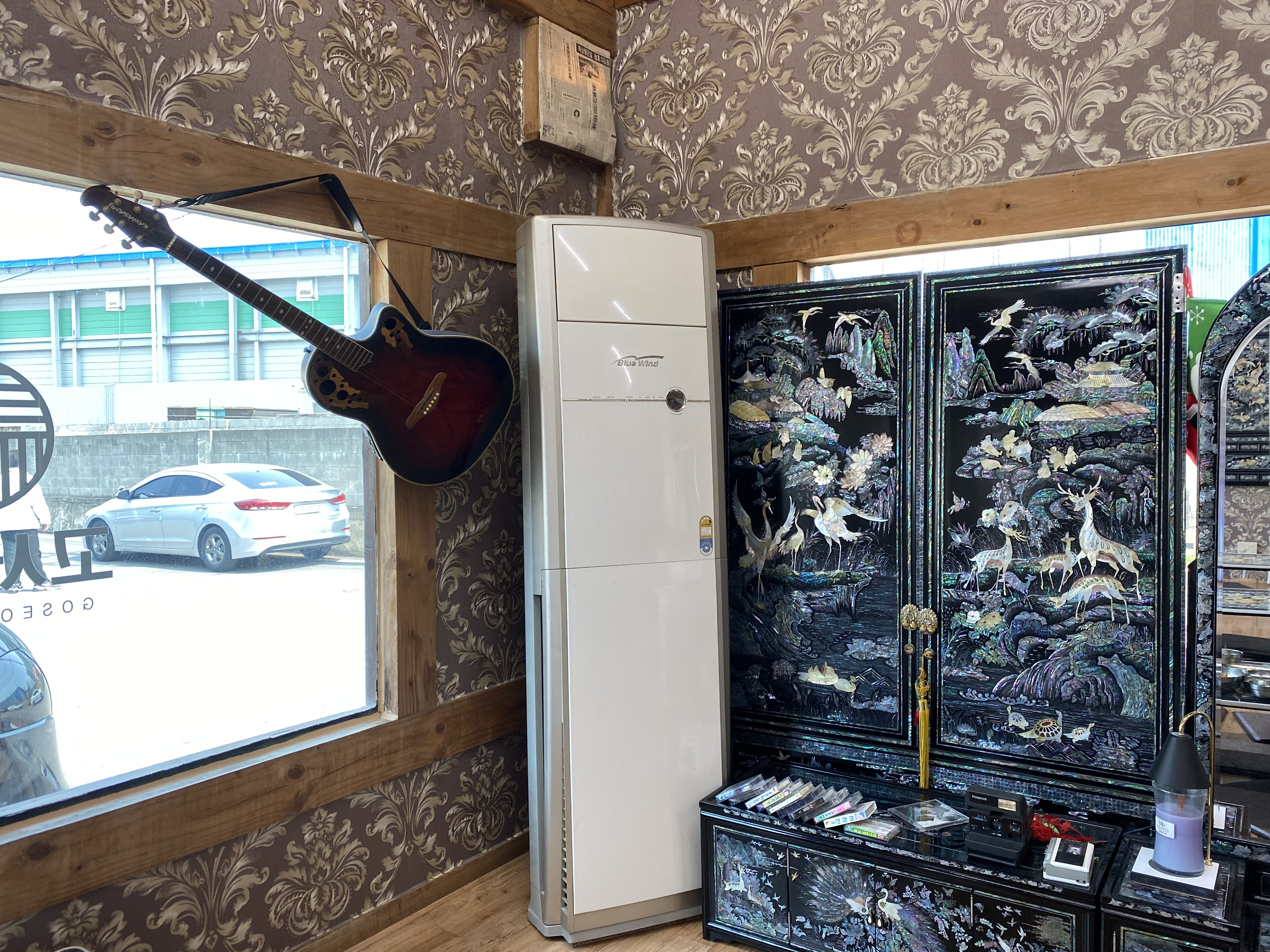 그리고 식당 입구에서부터 레트로 감성이 물씬 풍기는 음악과 소품들이 있었고 내부로 들어가니 왠지 시골 할아버지집에 가면 있을 것 같은 그런 소품들과 자개무늬의 가구들이 많이 있었습니다