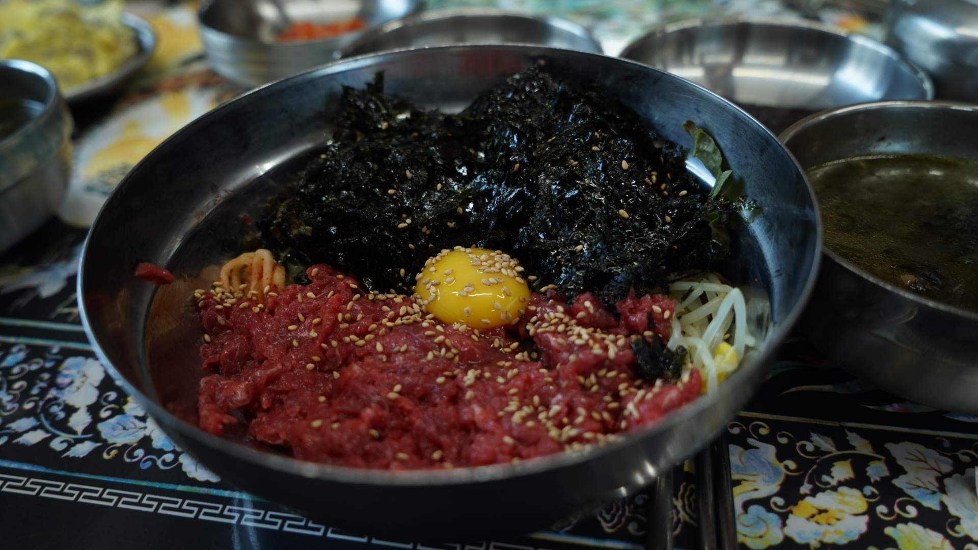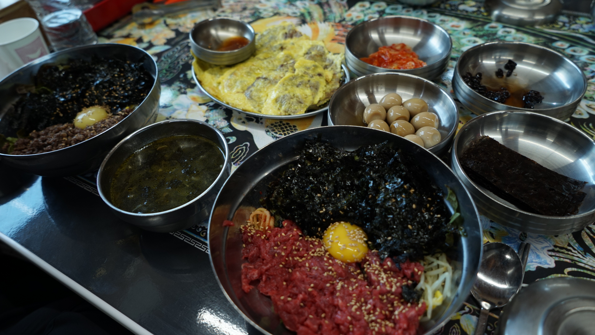 저는 육회비빔밥을 주문해서 먹었는데요 정말 육회반 밥반 정말 푸짐했습니다 그리고 비빔밥과 함께나오는 미역국에도 소고기가 듬뿍 담겨있었구요 진한 육수맛이 일품이었습니다