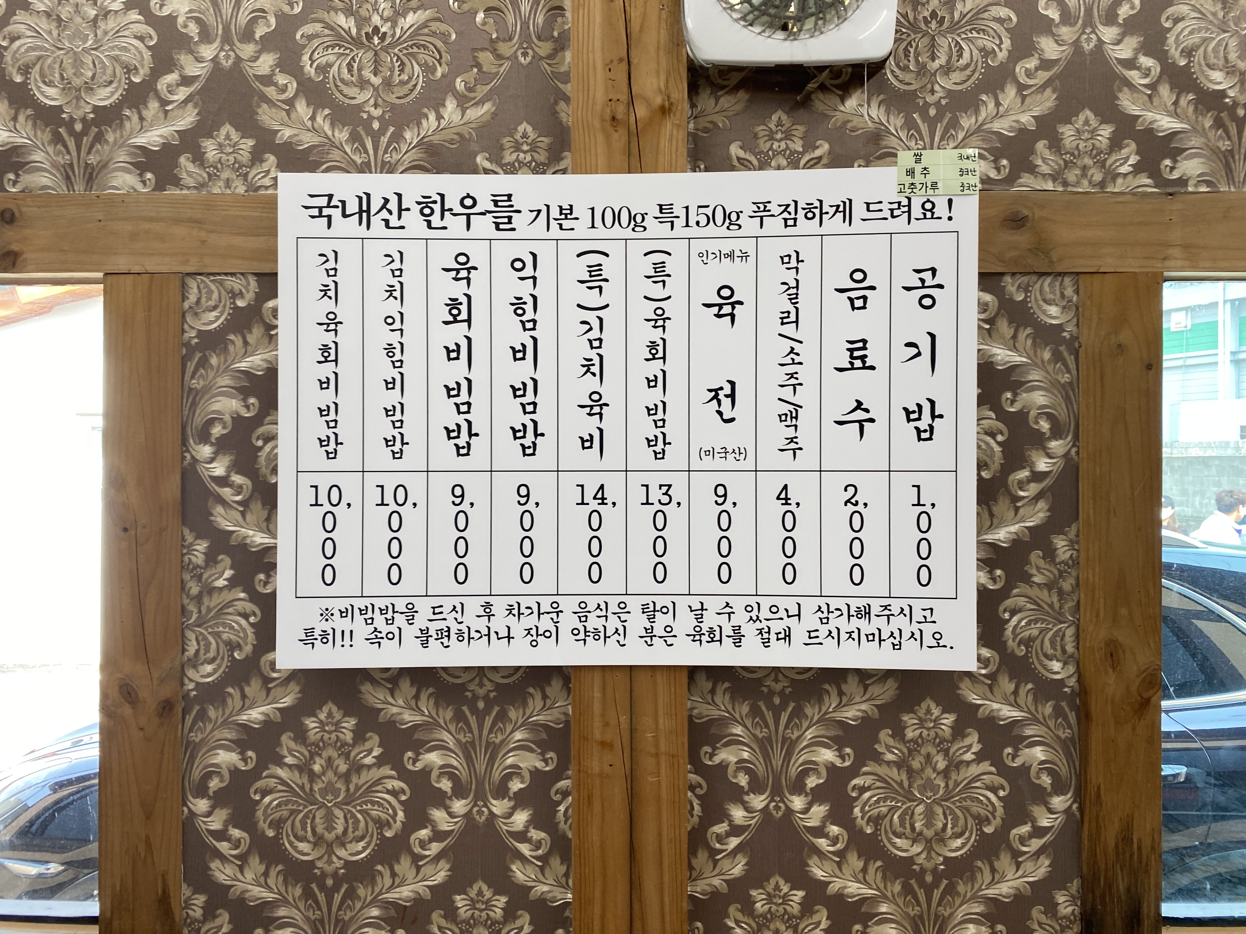 저희는 3명이 갔는데 육회비빔밥 2개, 익힘비빔밥 1개 그리고 인기메뉴 육전까지 이렇게 주문하였습니다 점심시간에만 반짝 운영이 되는 담양 고서회관, 비빔밥과 육전이 메인 메뉴이기 때문에 대기가 있어도 메뉴의 회전율이 높아 조금만 기다리면 금방 점심을 드실 수 있을 것 같습니다 저희는 평일 늦은 점심 1시반 쯤 도착했는데 대기없이 바로 들어갈 수 있었습니다