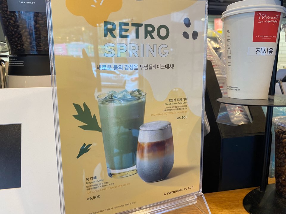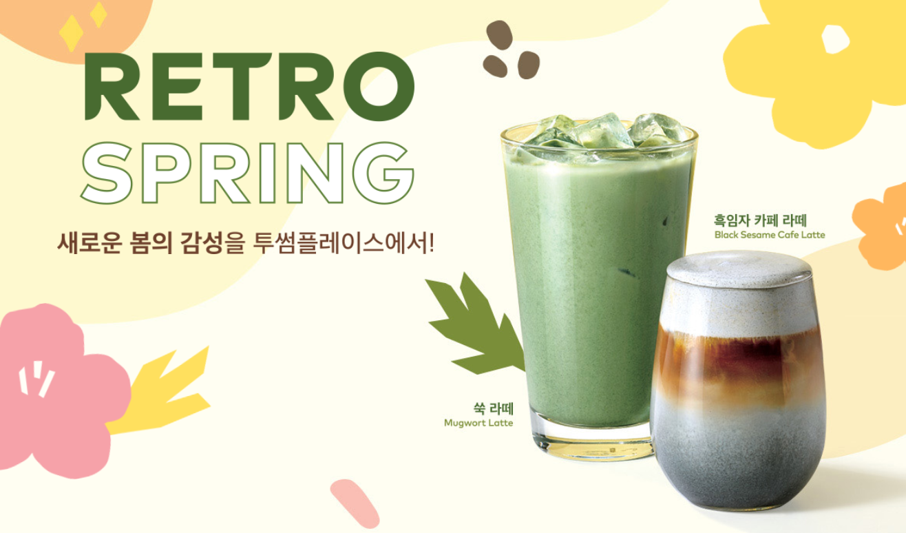 이번 투썸플레이스 봄신상 메뉴 음료는 쑥라떼와 흑임자 카페라떼 입니다 RETRO SPRING이라는 메인 카피라이트에 맞게 레트로 향수가 느껴지는 메뉴입니다