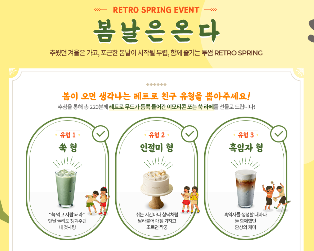 봄신상 메뉴 출시와 함께 투썸플레이스 홈페이지 에서는 RETRO SPRING EVENT가 진행되고 있습니다