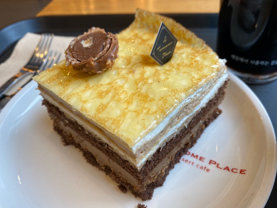 그리고 콜드브루와 함께 즐길 떠먹는 헤이즐넛 생크림 크레이프 입니다 초코와 생크립의 조합으로 크레이프를 겹겹이 쌓아 올린 부드러운 케이크 입니다 한 입 먹을 때마다 페레로로쉐를 떠먹는 것처럼 정말 달아서 콜드브루를 함께 시키기를 정말 잘 한 것 같다는 생각이 들었습니다(함께 간 일행과 저는 둘 다 단 음식을 잘 먹지 못합니다 하핫) 그리고 부드럽긴 하지만 위 아래 맛이 조화롭지는 않아서 밑에 초코 부분과 위에 부분을 분리해서 먹으니 더 맛있었습니다