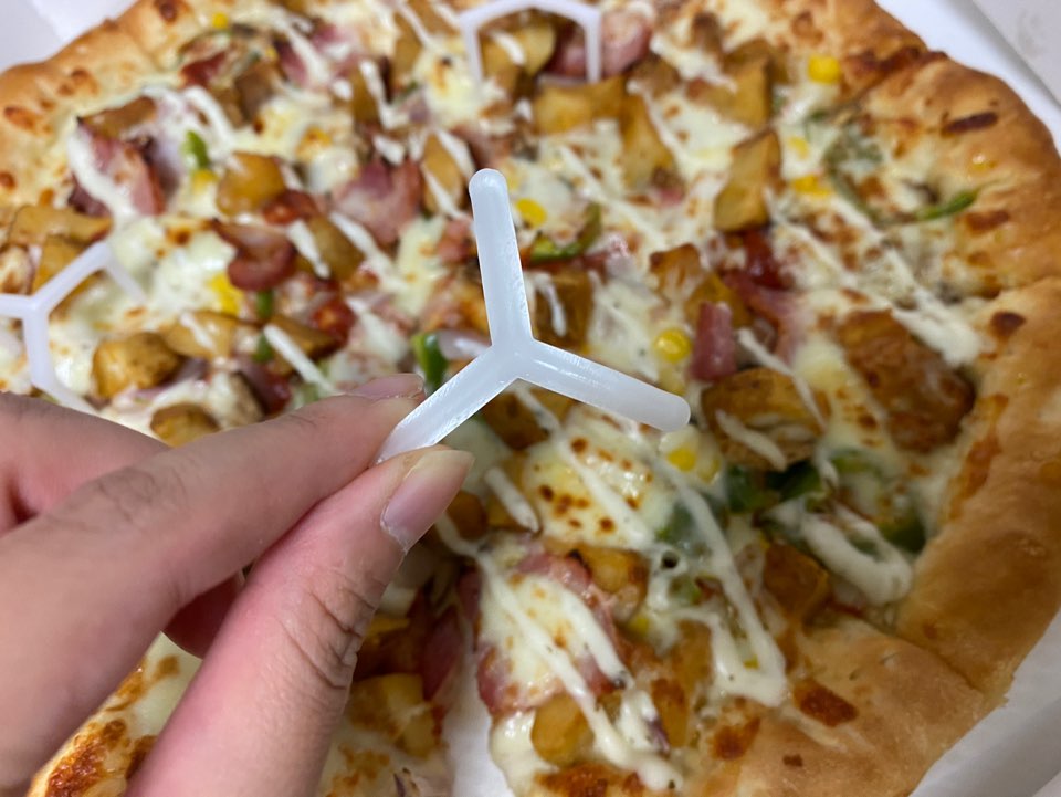 저희 집은 인원이 총 5명이어서 Large 사이즈에 1.5L콜라를 주문 했습니다 피자가 총 10조각으로 나눠져있어서 저희가족이 나눠 먹기는 편했습니다 Large 사이즈여서 고정핀이 3개나 들어가 있네요