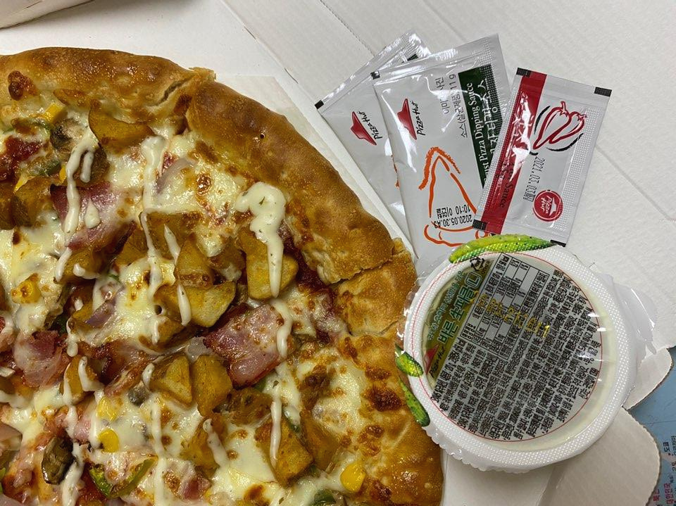 피자헛에서 피자를 주문 할 때 기본으로 따라오는 사이드 입니다 치즈디핑소스2개, 핫소스1개, 피클1개입니다 처음 피자헛에서 피자를 주문해서 당연히 디핑소스만 보고 갈릭디핑소스인 줄 알았는데 치즈디핑소스였네요 다른 곳은 핫소스나 디핑소스를 추가해야 하는데 기본 구성이라 좋은 것 같습니다