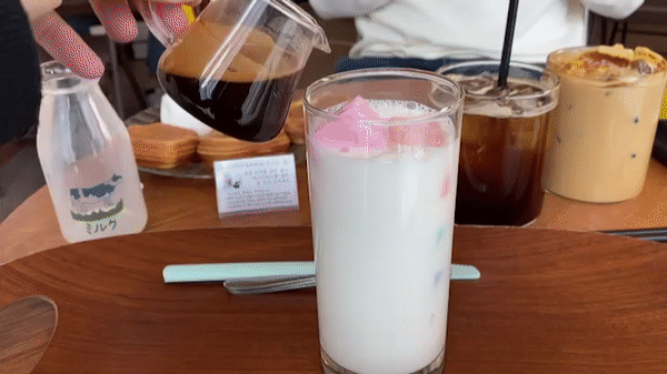 큐브라떼의 다양한 색감의 큐브들을 우유얼음입니다 먼저 큐브가 들어있는 잔에 우유를 붓습니다