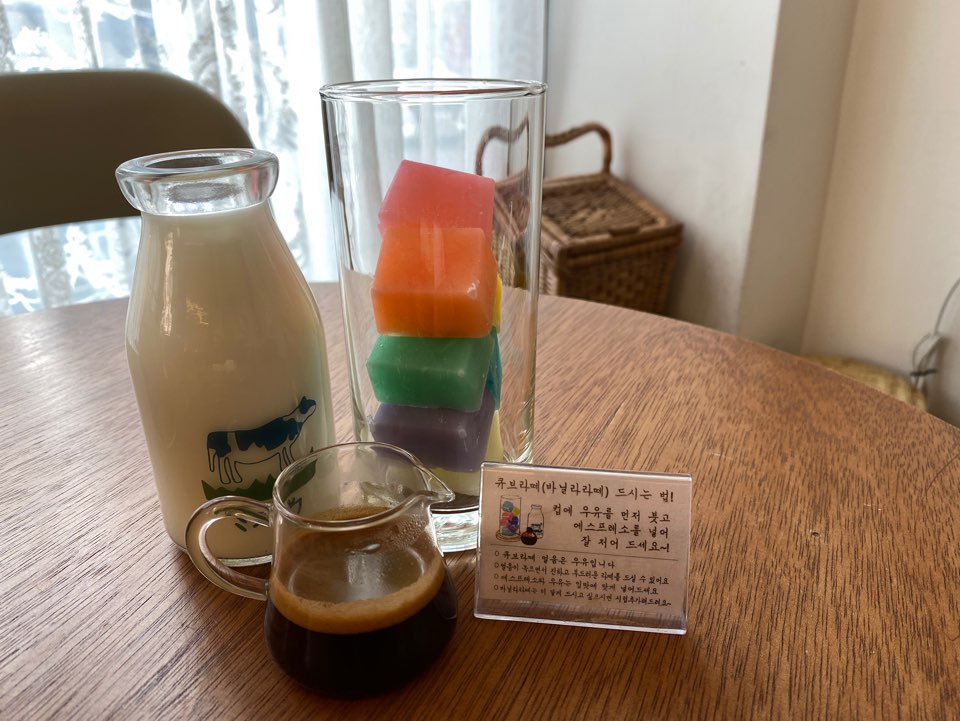 두 번째 큐브라떼입니다 큐브라떼는 2가지 종류가 있는데 시럽이 들어가지 않은 기본 큐브라떼와 바닐라시럽이 들어간 큐브바닐라라떼가 있습니다 큐브라떼도 동쿠커피의 시그니처 메뉴있데 눈으로만 보아도 카페분위기와 너무 잘 어울리고 색감이 굉장히 예뻤습니다