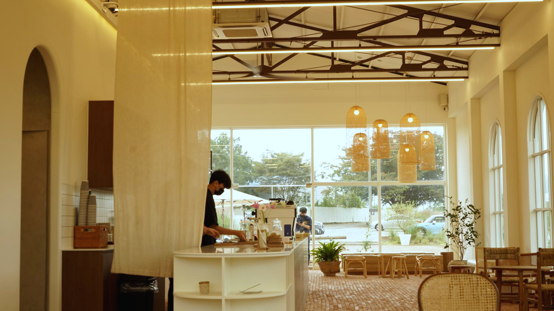 제가 방문한 날은 비가 조금씩 내리는 어두운 날이었음에도 불구하고 내부 조명과 라탄 소재의 인테리어 가구, 색감들로 따스한 느낌이 들었습니다